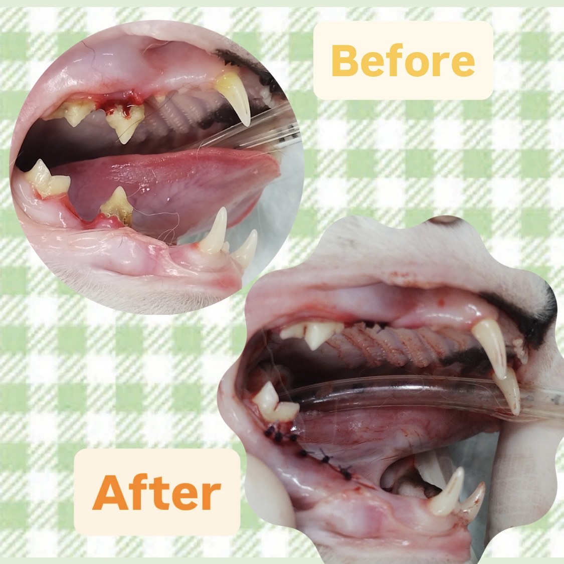 治療後 → 全身麻酔下で歯石を除去し、重度に悪化した歯は抜歯。歯肉を丁寧に縫合し、炎症の改善が期待できる状態になりました。