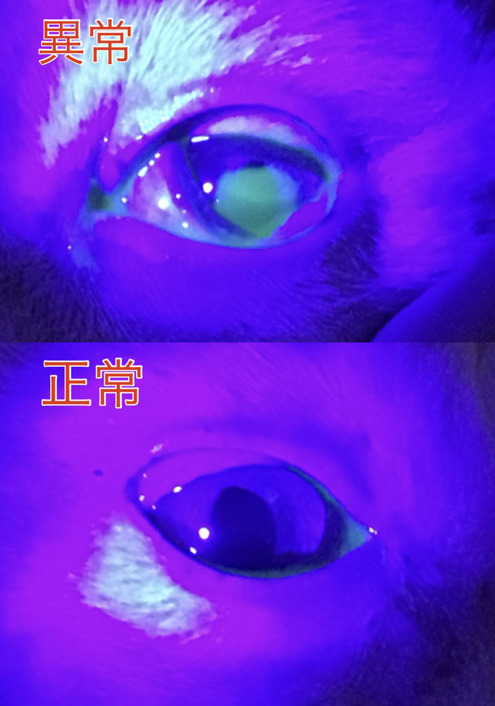 上の写真は猫の目を蛍光色素(フルオレセイン)で染色し、特殊な光で観察したものです。