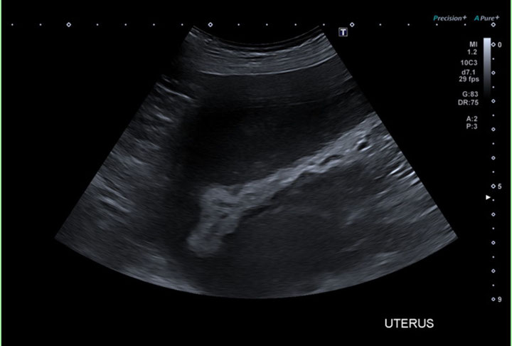 • レントゲン・エコー検査:子宮の拡張、内部に液体がたまっている様子を確認(今回の画像のように)