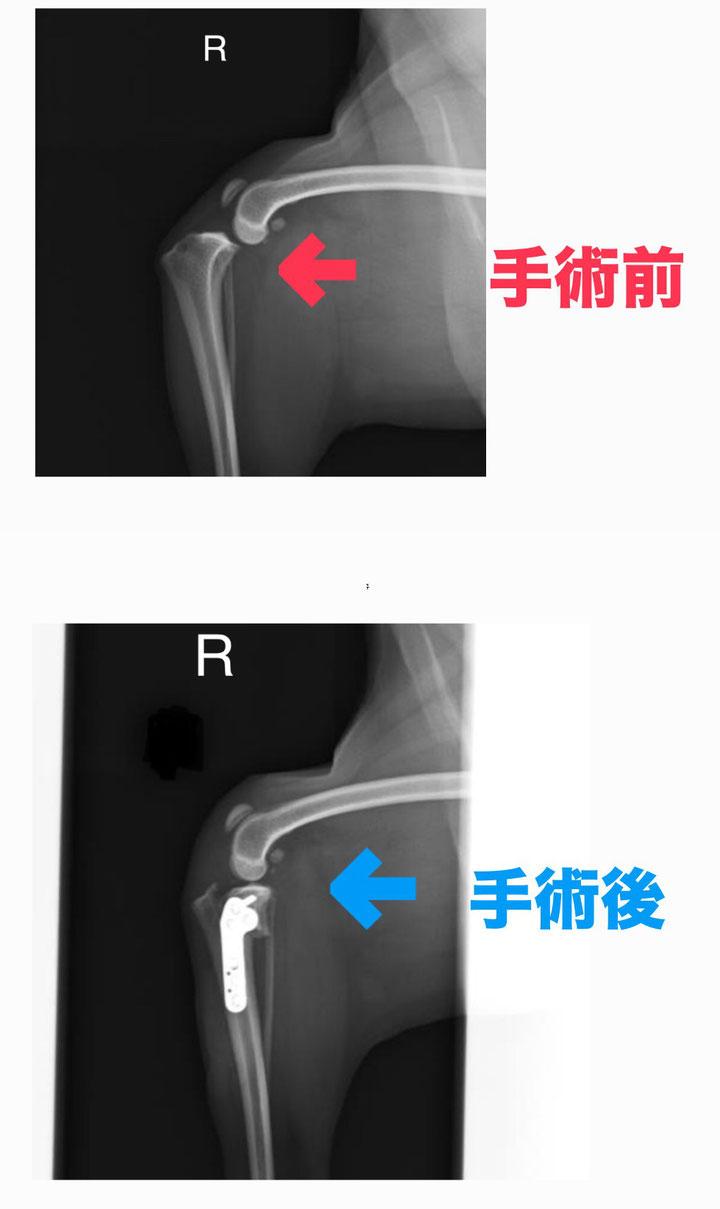 📸 上の画像は、TPLO手術前後のレントゲン写真です。