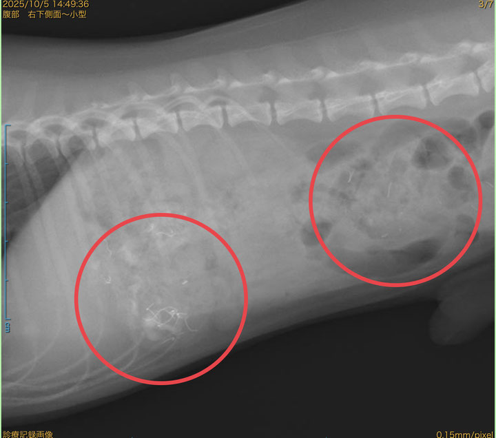 今回のレントゲン写真は、犬が電気コードをかじって銅線を誤食した症例です。